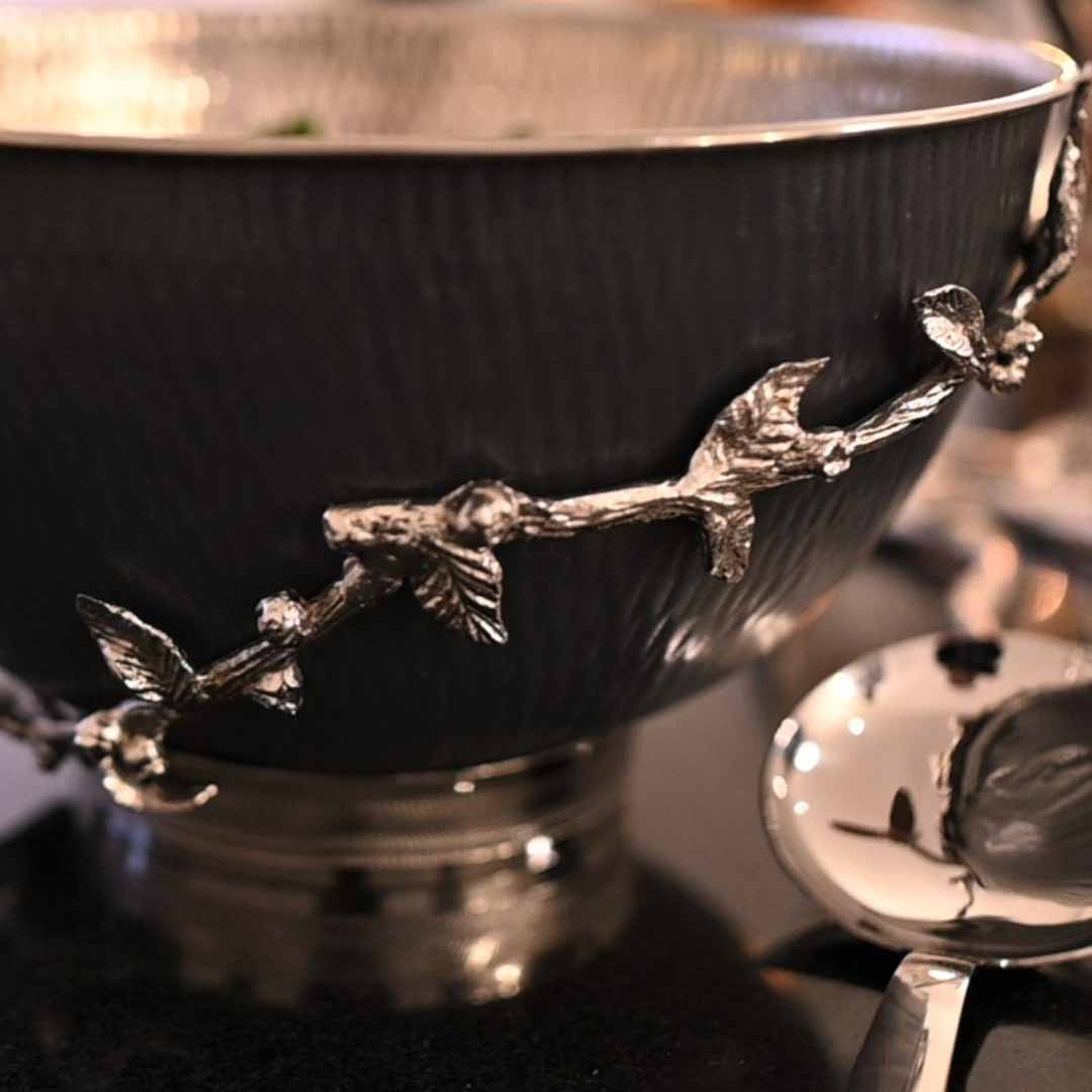 - Round stainless steel flat bowl with scratch-resistant coating on a chrome-finished brass botanical-inspired detachable base.